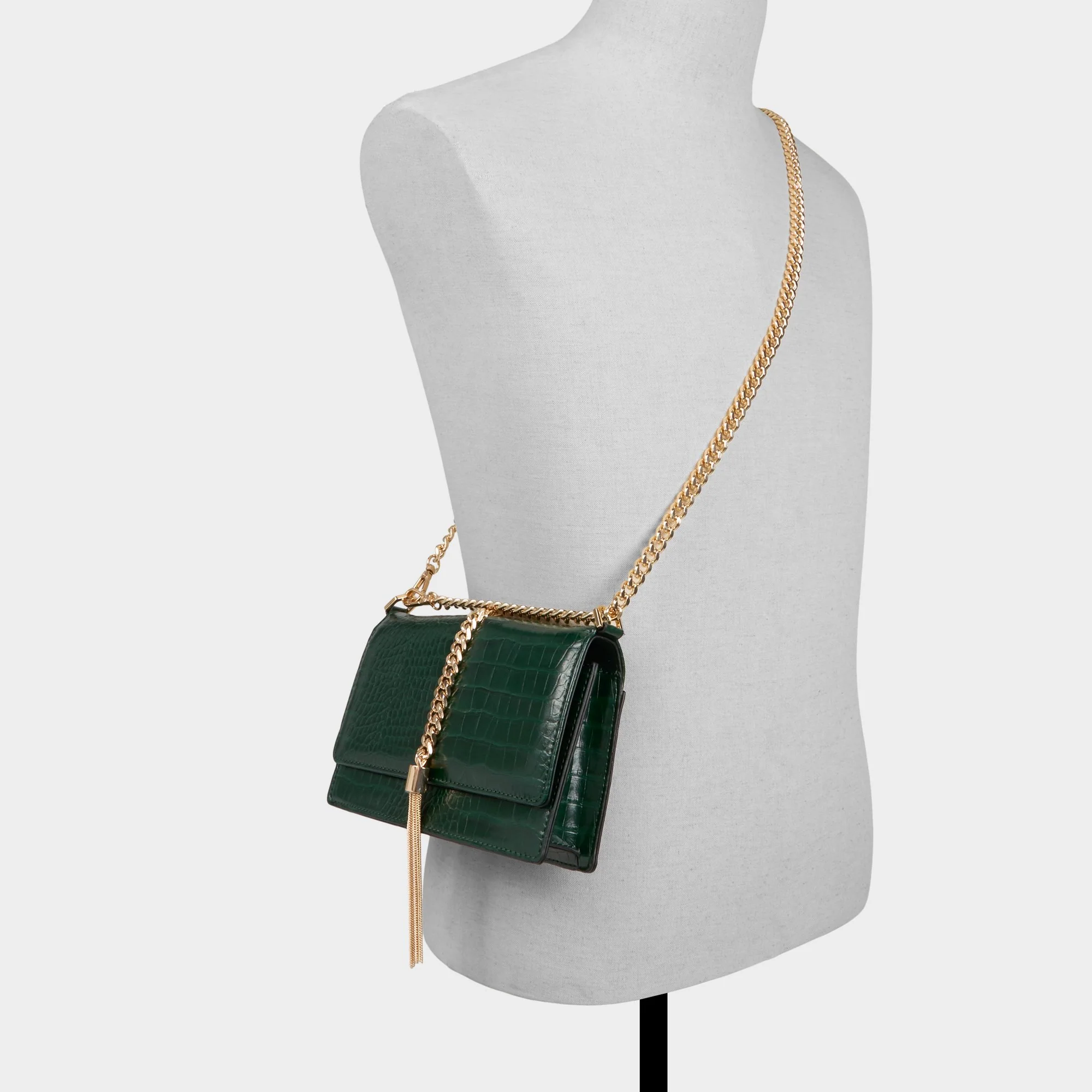 Forest-green croc-embossed leather wraps a chain-frame across this crossbody, turning it into a luxe jewel you can carry from coffee runs to after-dark gigs, with a glow that follows you through the day. Carry it with a satin slip for cocktails or sling it over a graphic tee and leather pants for city gigs.
