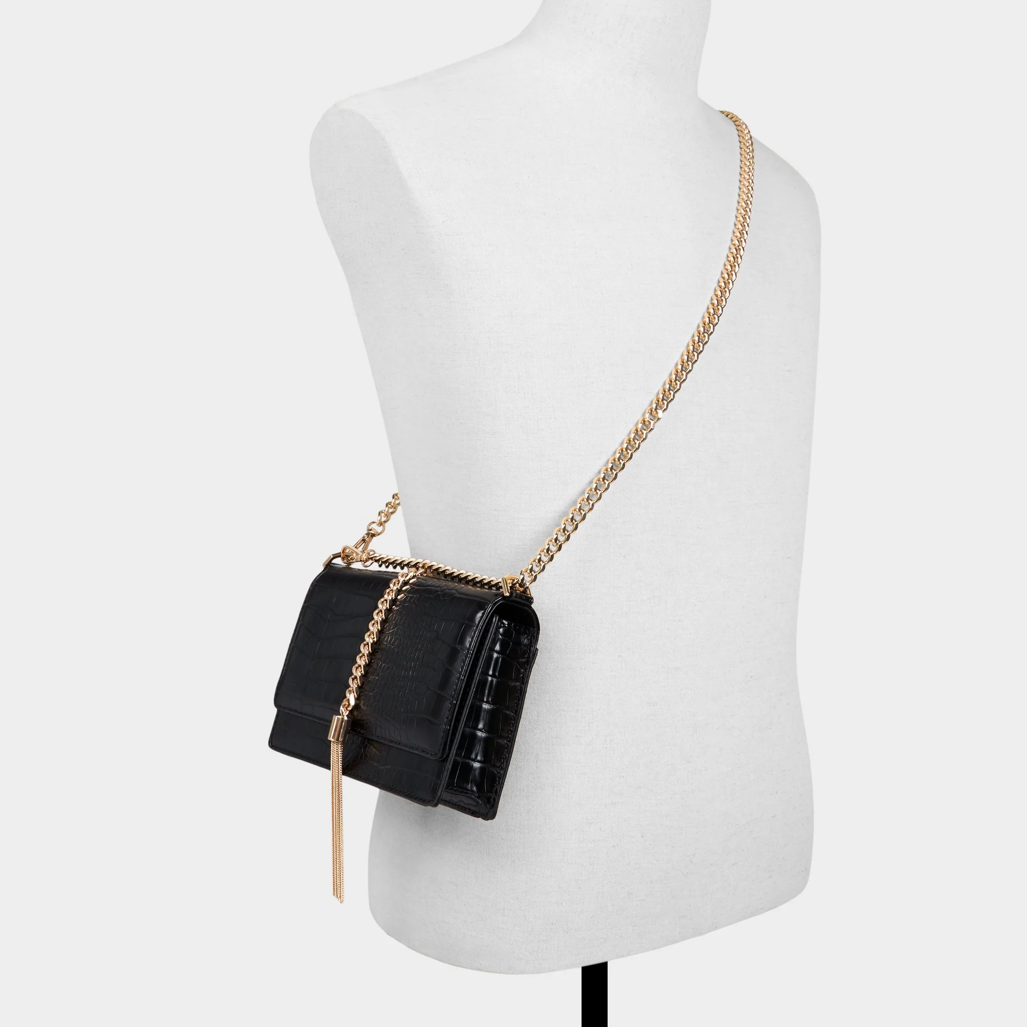 High-gloss croc embossing pairs with a gold chain, making this compact crossbody perfect for evenings out, while the turn-lock flap keeps essentials secure. Sling it over a slip dress for rooftop dates or pair it with denim on coffee runs for a touch of shine.