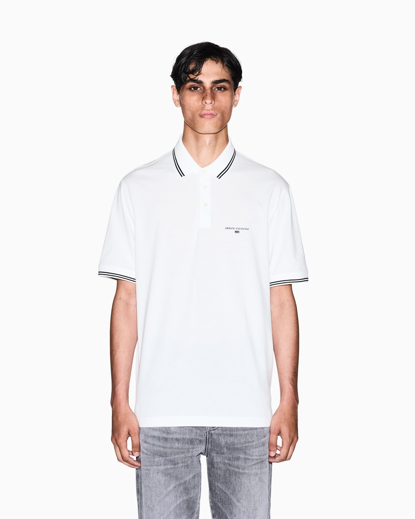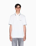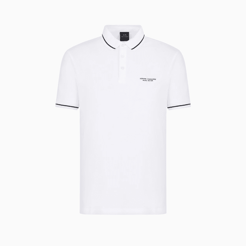Polo shirt made of soft cotton jersey, a timeless classic reinterpreted with a cool and contemporary touch. This essential piece stands out for its refined details, such as the collar and sleeve edges with contrasting piping that add a graphic and sporty touch. The small Armani Exchange logo embroidered on the chest discreetly signs a versatile and always current look