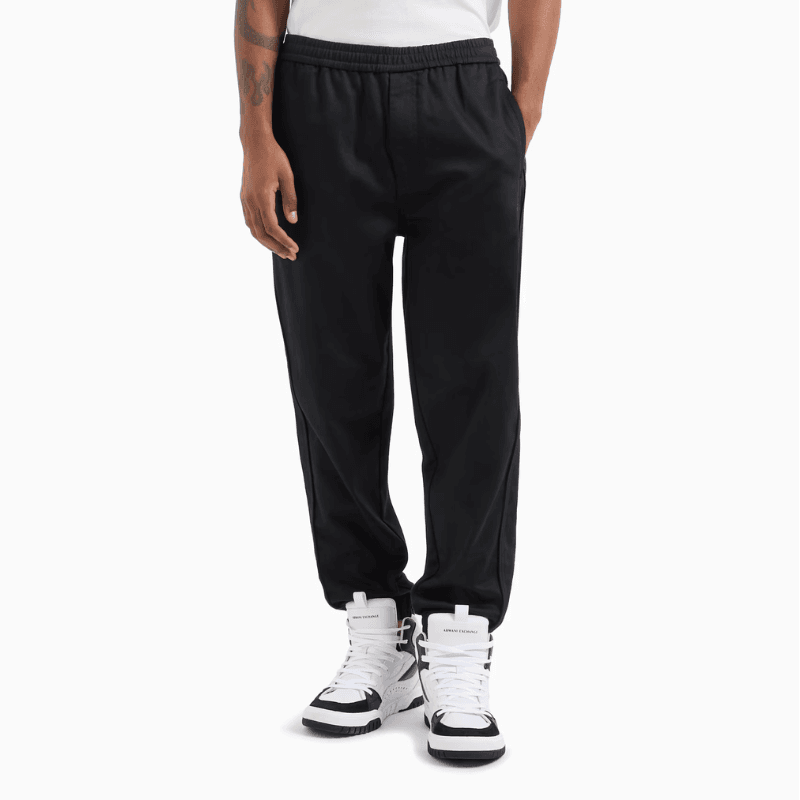 Essential design for these jogger pants where the protagonist is the color black: expression of the contemporary style of A|X Armani Exchange is the common thread of a part of the collection. These pants are made of stretch satin fabric and have a tonal band on the side of the leg.