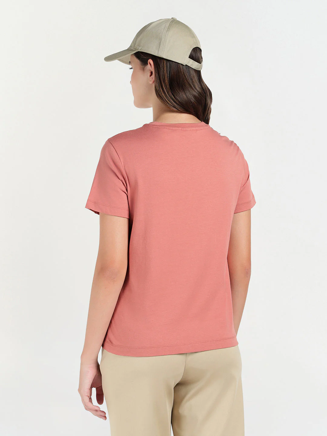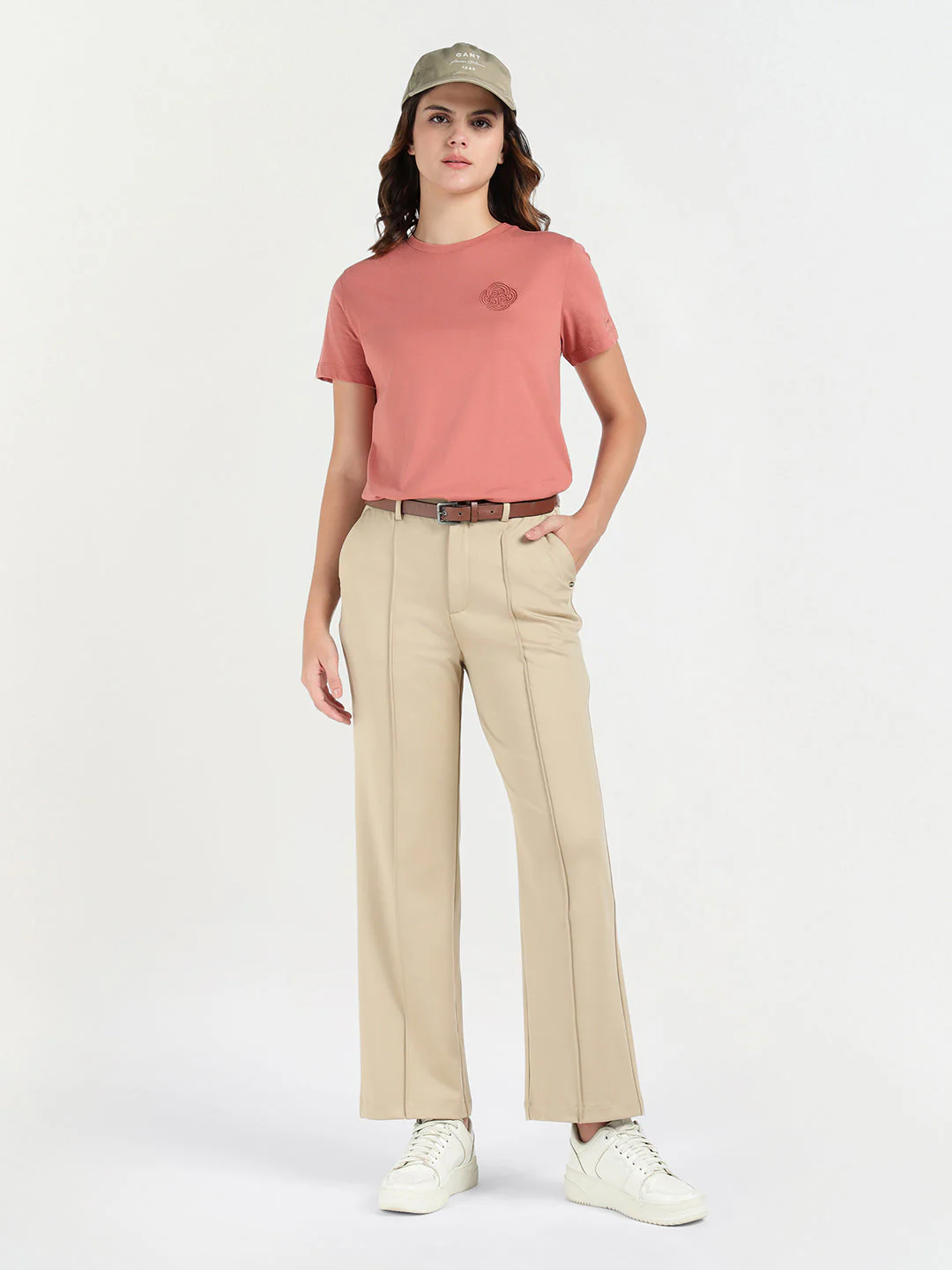 Elevate your everyday style with GANT Women Peach Cotton knitted embroidered crew neck short sleeves pull over T-shirt.