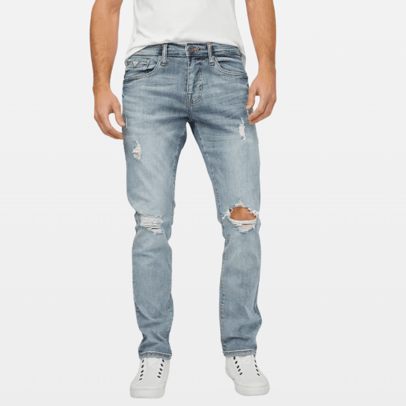 - Light indigo wash with destroy details and whiskering. Each garment has its own unique appearance.
