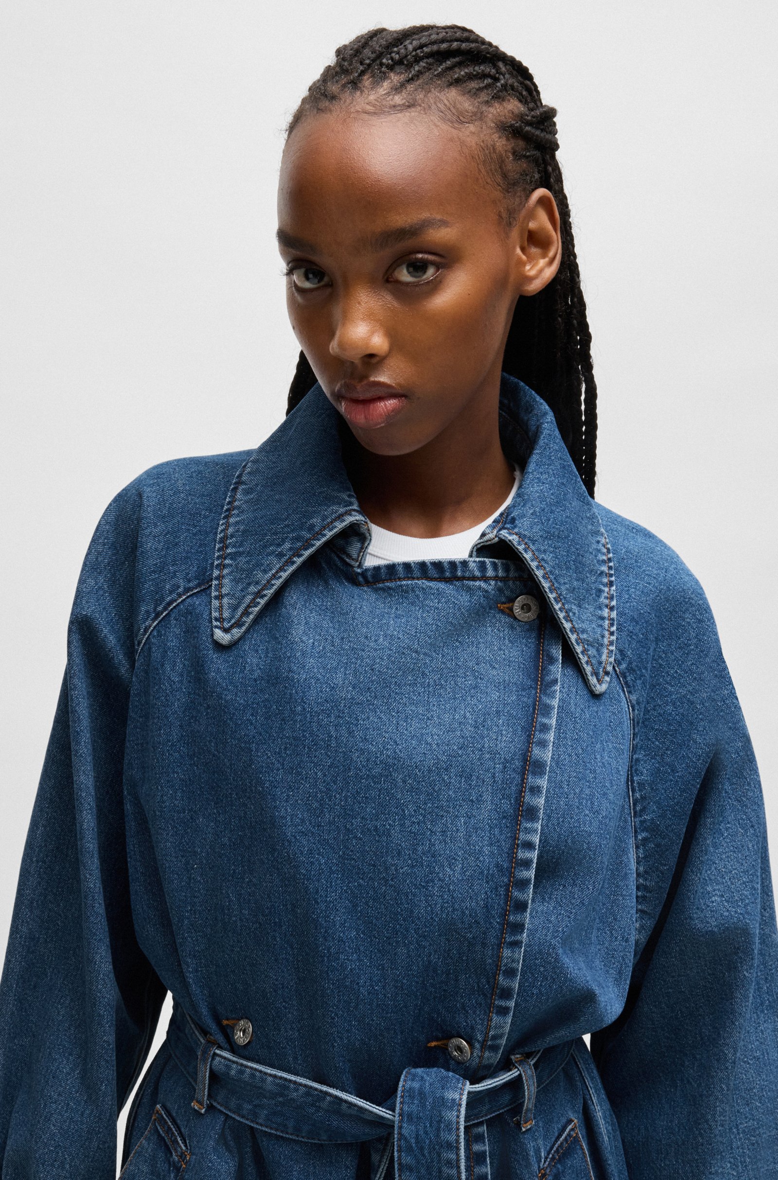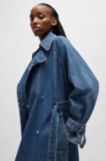 This belted trench coat from HUGO Womenswear is crafted in rigid denim for a creative look. Authentic dark-blue wash with contrast stitching. Maxi length.