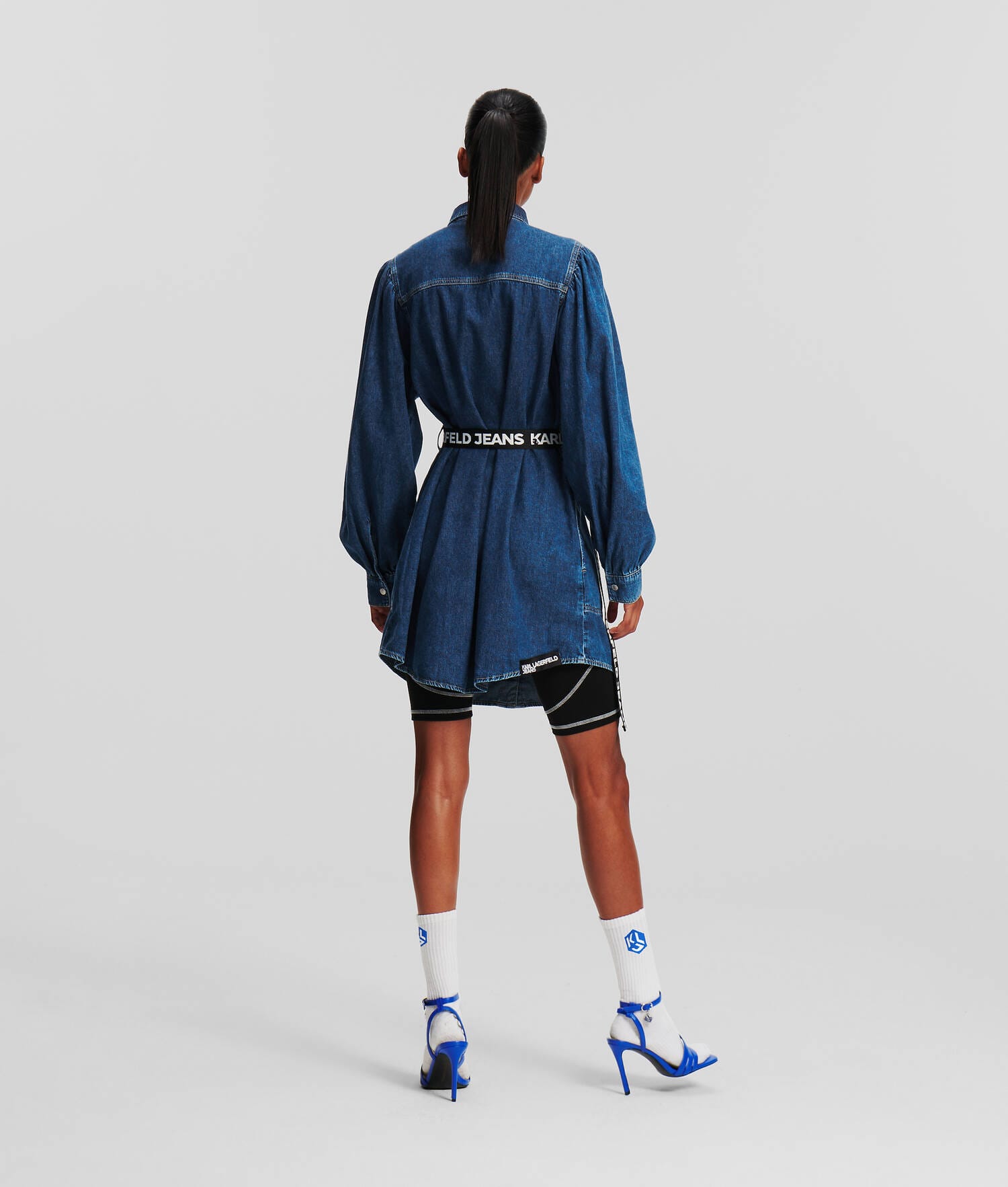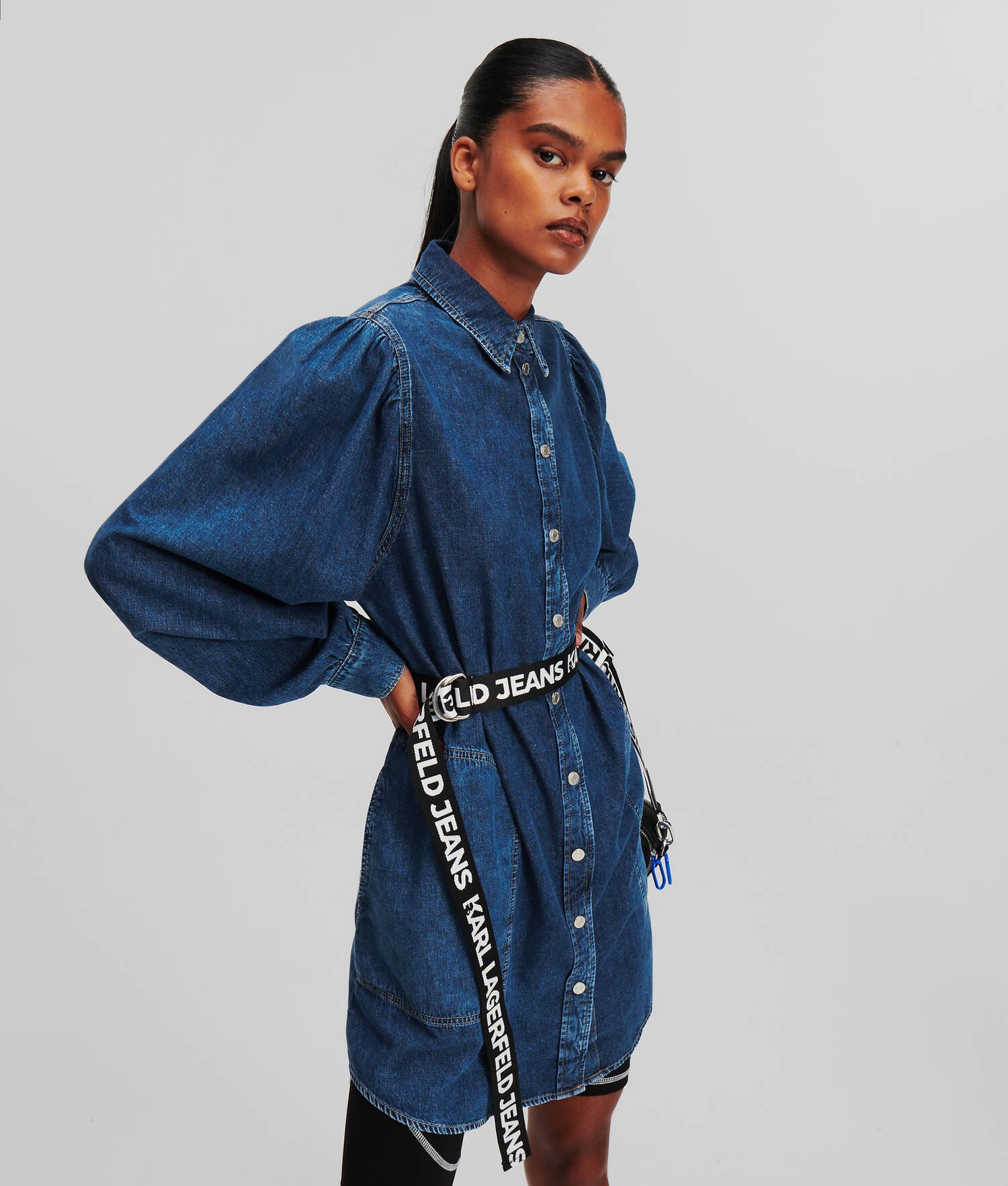 KLJ BELTED PUFF-SLEEVE DENIM DRESS