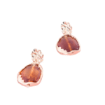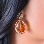 The statement drops are crafted from glossy amber-toned resin, offering a rich, warm glow reminiscent of natural polished stone. -