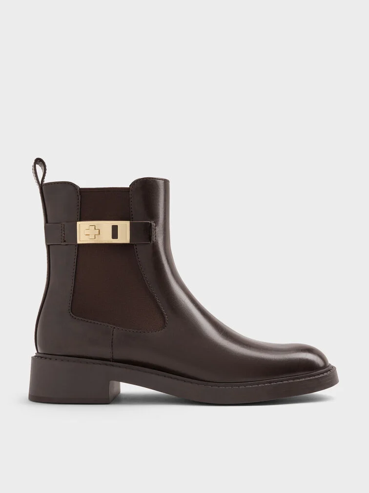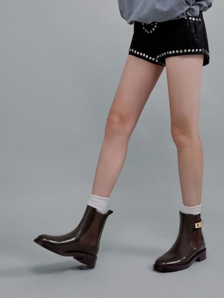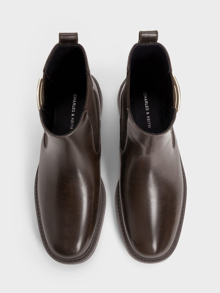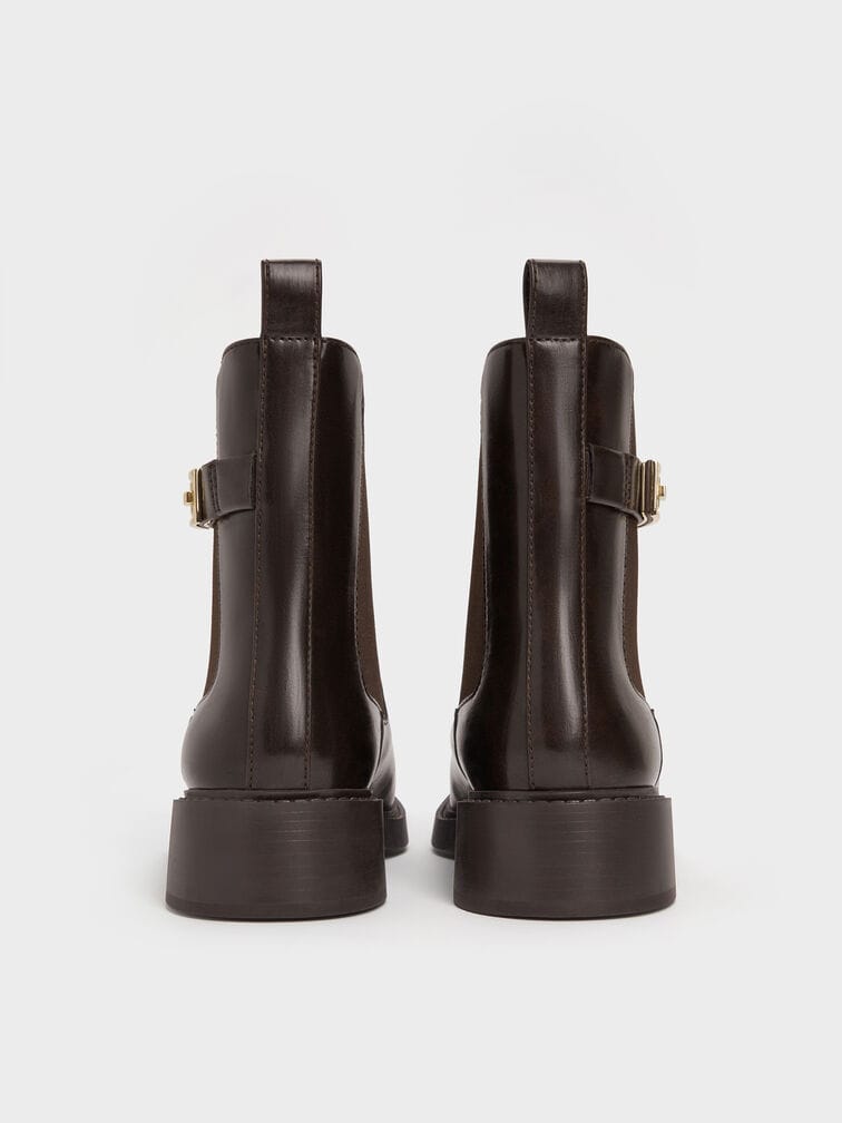 These Lando Chelsea boots in dark brown are made with faux suede and feature metallic buckles, a soft textured finish and sturdy block heels. Use them to balance smart tailored ensembles with luxurious tactility.