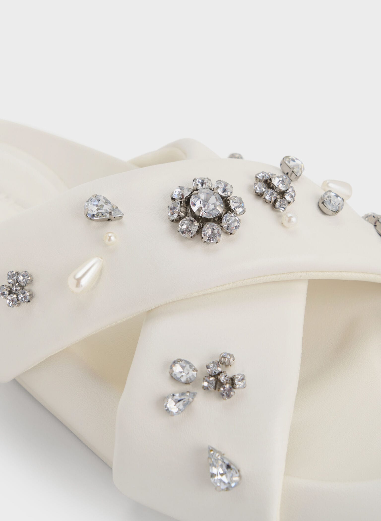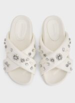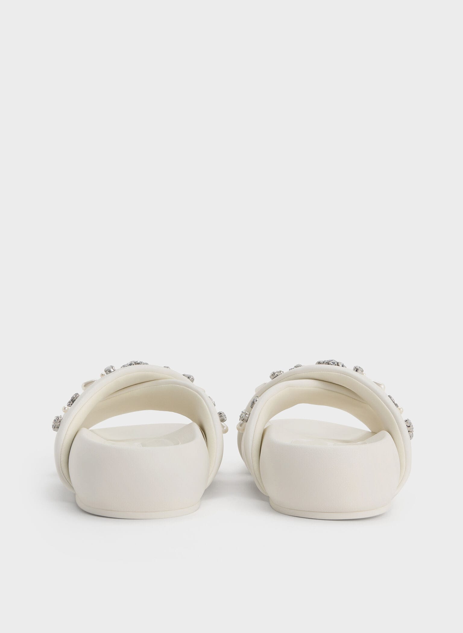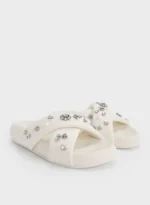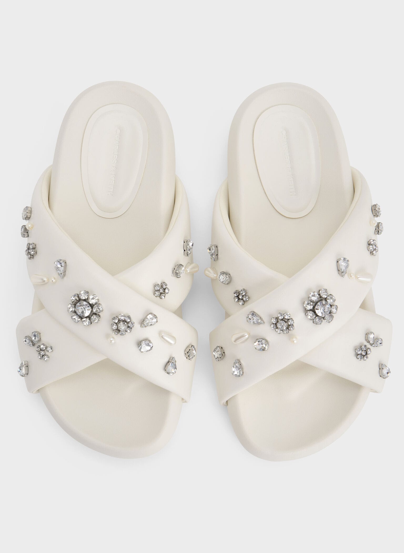 In addition to their striking white finish, these flatform sandals are adorned with shiny gem and pearl embellishments that make them especially eye-catching. An elevated take on a casual shoe style, this pair is perfect for days when you want to look more dressed up without the extra effort.