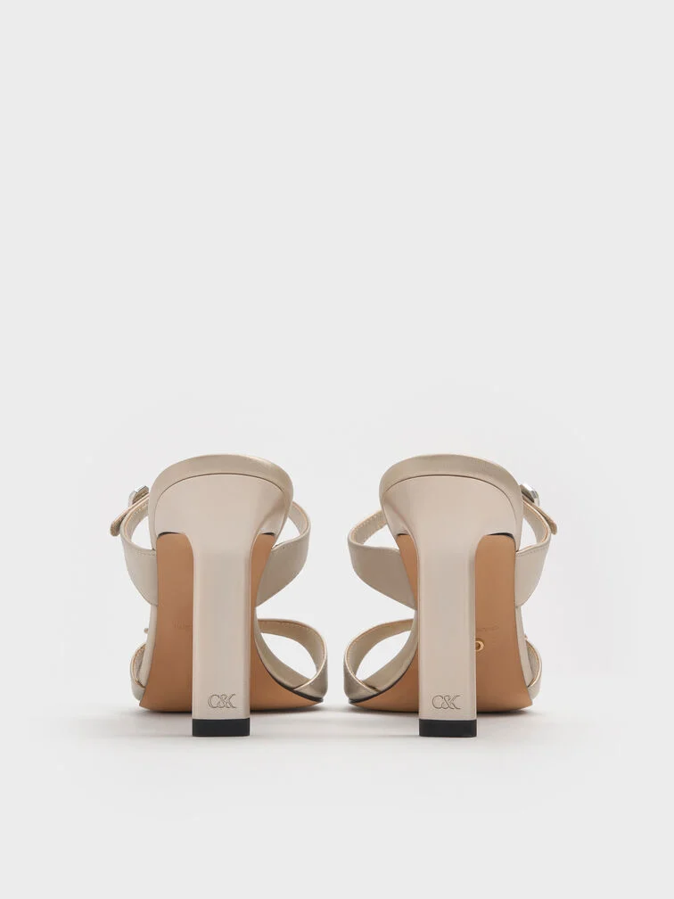 These heeled sandals in ivory are made with pearlescent leather and feature a double-strap design, open square toes, high blade heels and gem-buckle embellishments. Let them refine fluid separates or soft tailoring with an iridescent glow.